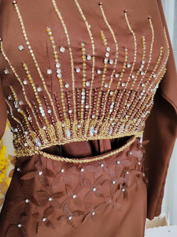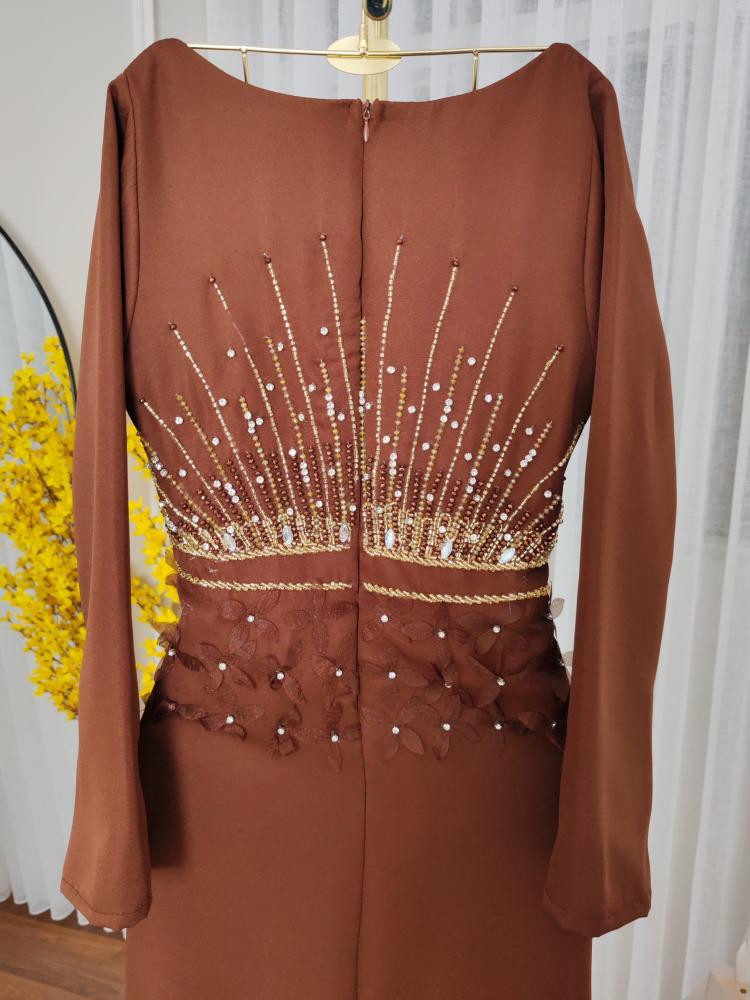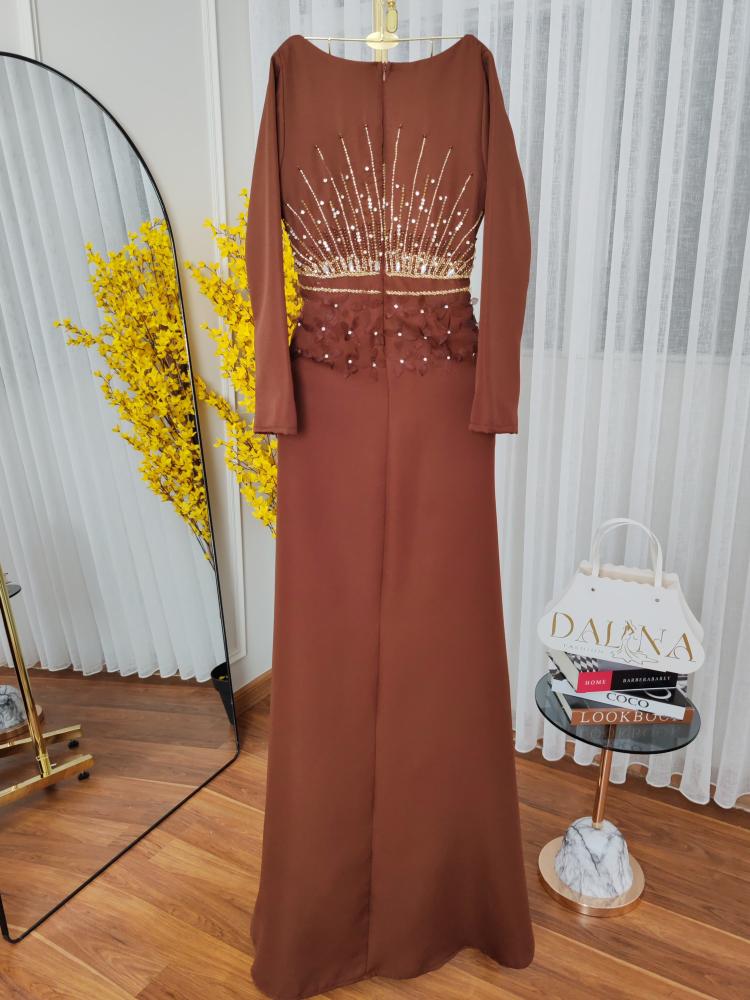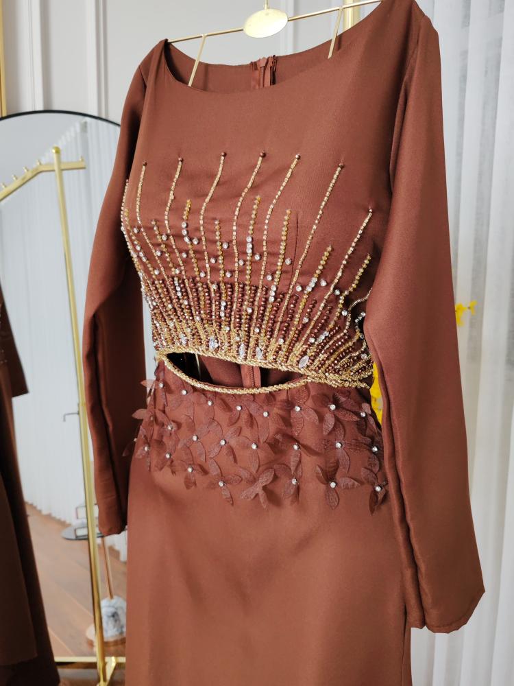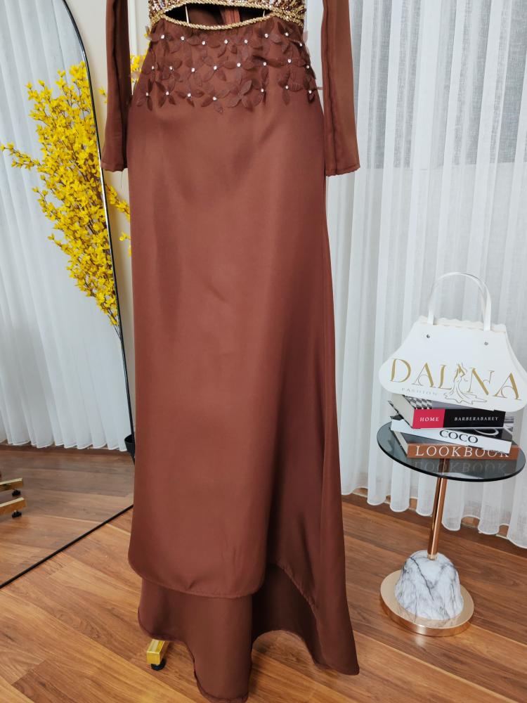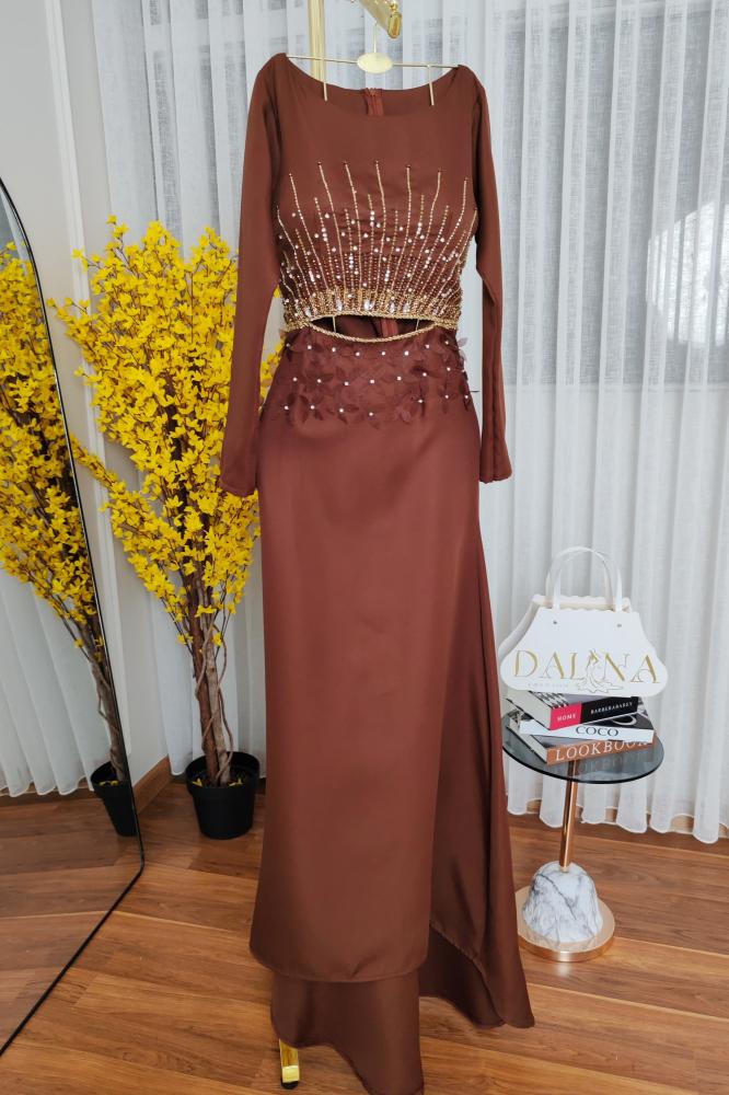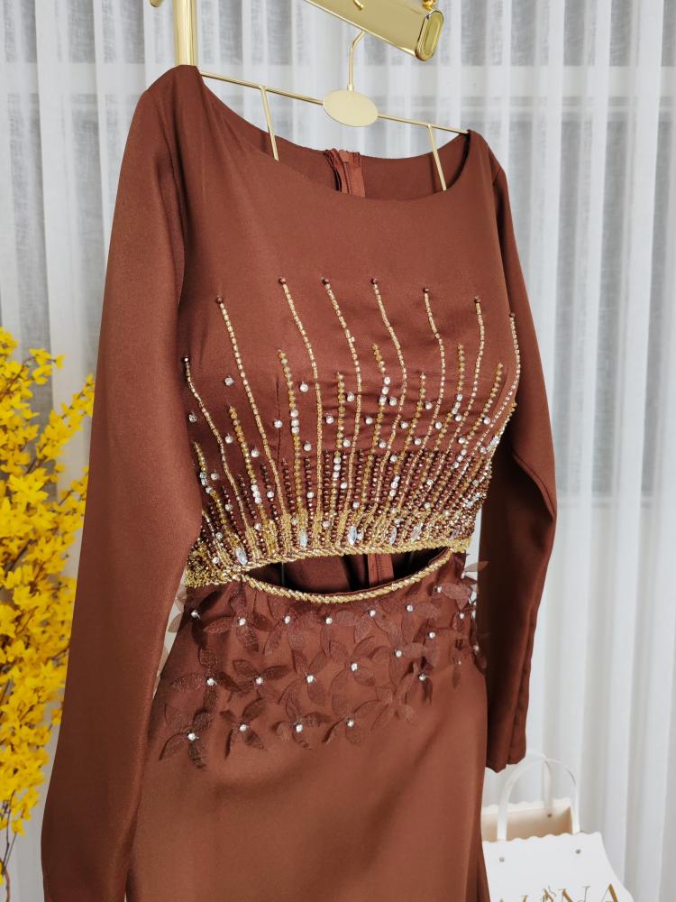 فستان سهره من دالينا بني مطرز بحبات الكريستال على الصدر ميما يضفي على الفستان لمسه من الجمال تخليكي متميزه بين الحضور